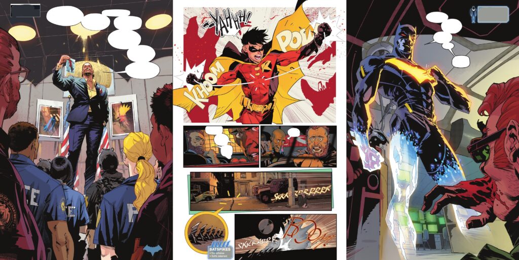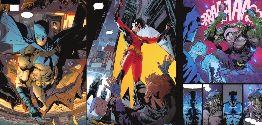 Entre medias, la Batfamilia aparece como lo que es: una unidad que funciona, pero con grietas. Hay escenas domésticas (Bruce con Tim y Damian, la mecánica del Batmóvil como excusa de paternidad improvisada) que sostienen la etapa porque dan calor humano sin necesidad de melodrama.